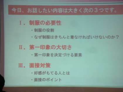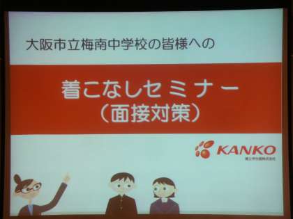 本日、土曜授業参観の時間を活用して、3年生生徒を対象に『着こなしセミナー(面接対策)』を開催しました。講師には、民間企業(菅公学生服株式会社)から原田明典様を講師にお招きして行いました。「制服の必要性」「第一印象の大切さ」「面接対策」の3つの内容について分かりやすくお話をしていただきました。3年生の子どもたちは、とても真剣に話を聞いていました。「月曜日には、とても美しく制服を着こなして登校してくれるとことでしょう。楽しみです!」