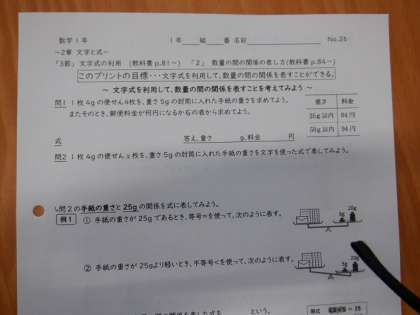 「文字式」の単元で、関係を表す式を等号・不等号を使って表しています。