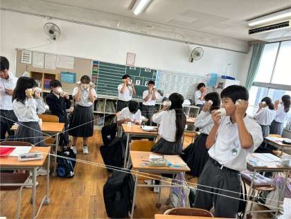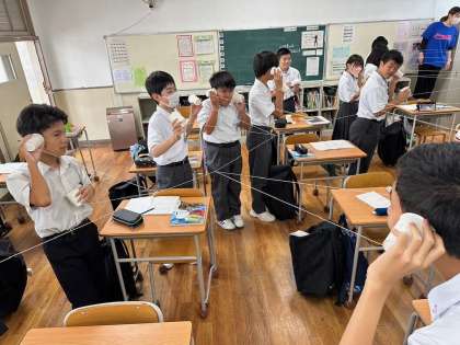 音の伝わり方を調べるために糸電話を作ってクラス全員で会話できるか実験しました!