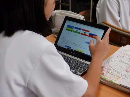 「新聞」を作成します。どんな内容にしようか一人一台端末を使って調べています。