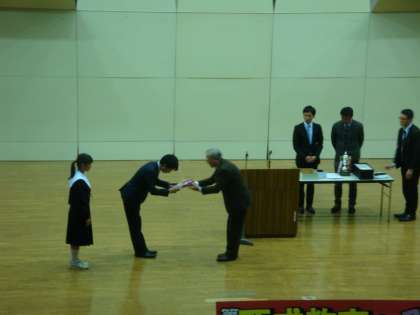 『西成教育フェスタ杯』サッカー大会(第3回)は、11月14日から予選リーグ、12月5日・6日に決勝リーグを行い、本校サッカー部がみごと優勝し2連覇達成!バレーボール大会(第1回)は、西成高校を会場に11月21日に行われ、本校バレーボール部が優勝し、アベック優勝達成!写真左は、本日行われたサッカー部(本日公式戦のため代理)、右はバレーボール部の表彰式の様子です。「よくがんばりました。おめでとう!」