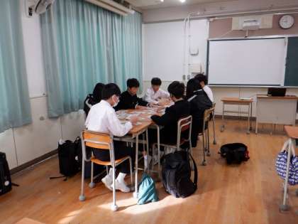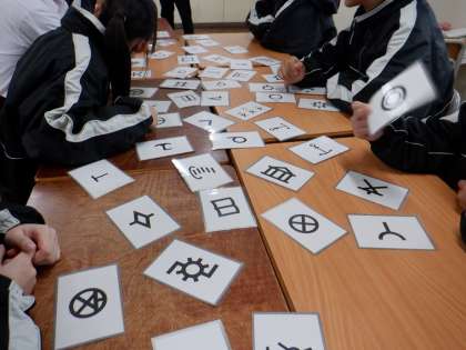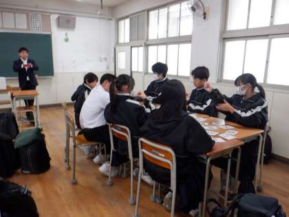 地図記号を使ってのカルタをしています。10枚以上取った人は「地図記号マスター」の称号を得ました。
