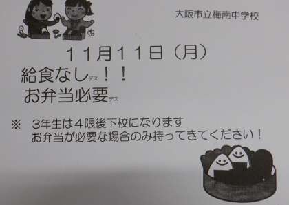 まつば小学校が代休のため、11月11日(月)の給食の提供はございません。