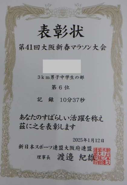 先日実施しました、3年生の陸上部の生徒が大阪新春マラソン大会で6位入賞しました。