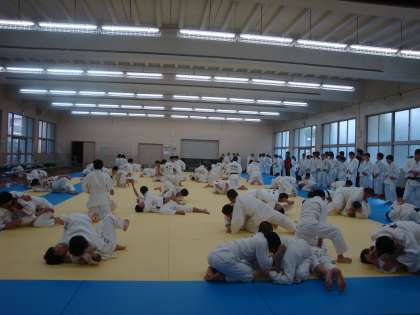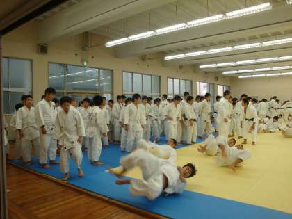 写真は、柔道部の練習の様子です。20校近い学校から練習に来ていただきました。柔道場は約300畳の広さがありますが、所狭しの状態です。今日は、顧問の先生方の『審判講習』も兼ねて行われています。