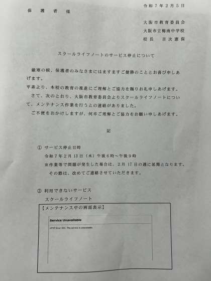 大阪市教育委員会よりお知らせがありました。ご確認ください。