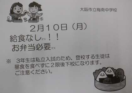 なお、3年生は私立入試のため、登校する生徒は2限終了後下校となります。お弁当は不要です。