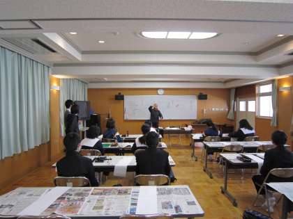 参加生徒は12名。はじめに高橋先生から、書道を行う心構えや書き方などの講義がありました。そのあと、自分が書きたいと選んだ四字熟語など好きな言葉を、先生が書いた達筆な見本をもとに何枚も書いて練習し、最後は清書しました。