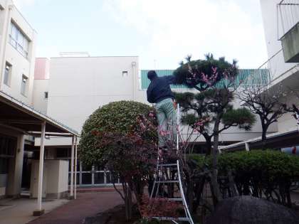 管理作業員さんが、体育館前の松の木の剪定をしています。