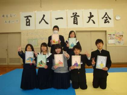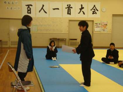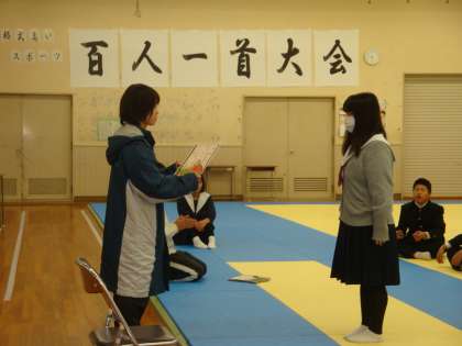 昨日、開催された2年生『百人一首大会』の表彰式が、本日の学年集会で行われました。男子の部 優勝〜3位、女子の部 優勝〜3位、そして団体優勝の2年2組に、それぞれ手づくりの素晴らしい賞状が学年主任より手渡されました。