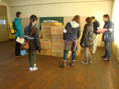 写真は、防災用備蓄倉庫内での確認の様子です。