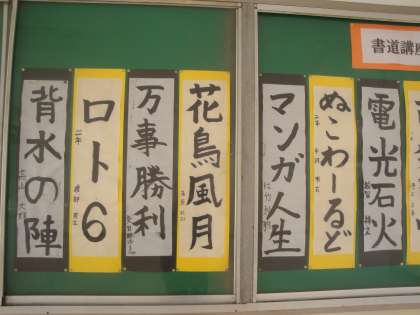 1月16日(土)に、学校元気アップ主催でサタデイワーク特別講座『書道教室』を行いました。その時の作品をピロティーに展示しています。