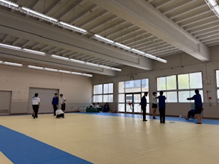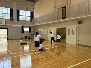 女子は集団行動のテストと体力測定(反復横跳び)を行っています。