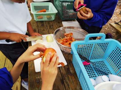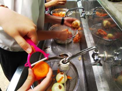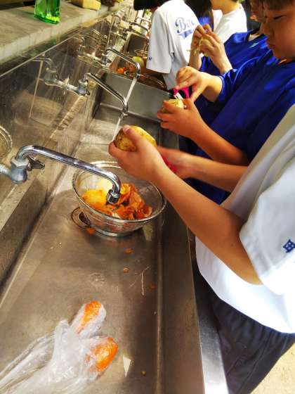 玉ねぎ、ニンジン、じゃがいもをきります。