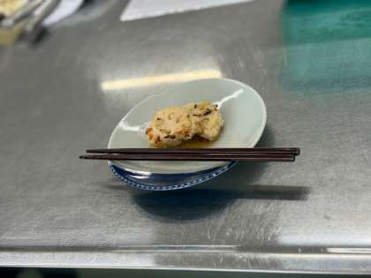 れんこんのはさみ焼きを作っている様子です。