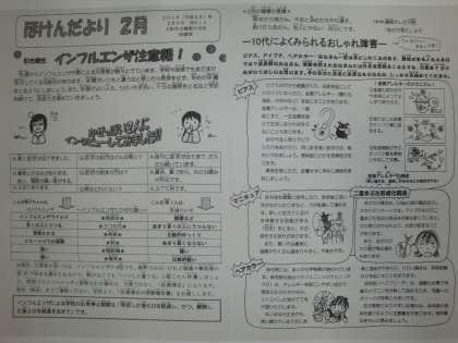 本日発行の「ほけんだより 2月」には、インフルエンザとかぜの違いが書かれています。よく読んで感染予防に努めてください。