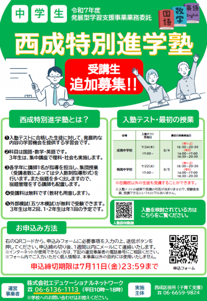 令和7年度西成特別進学塾が5月より開校されています。現在、募集枠があいていますので、入塾を希望される方はぜひお申込みいただければと思います。