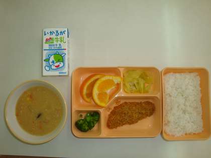今日のメニューは、「クリームシチュー」「ブロッコリー」「サーモンフライ」「キャベツのピクルス」「いよかん」で、味の方はまずまずの評価でしたが、「男の子には足らないかも?」の声もありました。