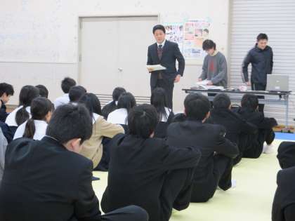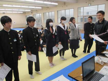 写真左は「表彰式」、右は「校長先生から講評」の様子です。