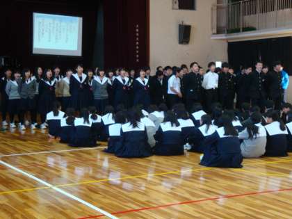 大切なことは、在校生全員が一生懸命に歌うことです。そこに感動が生まれます。今日の練習で一生懸命に歌えなかった人は,「卒業生にとっては一生に一回の中学校の卒業式であること」や「様々な思いを持って卒業式に臨むこと」を考え、感動できる歌声を精一杯届けることが在校生全員にできる最高のプレゼントとなるはずです。