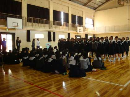 本日5時限目に来週行われる『卒業書証書授与式』の歌の練習(在校生)を行いました。2年生が1年生に見本を示す形で練習が行われました(写真左)。「さすが、上級生と感じさせる歌声でありました。」1年生も先輩に負けじと一生懸命に歌っている姿がありました(写真右)。