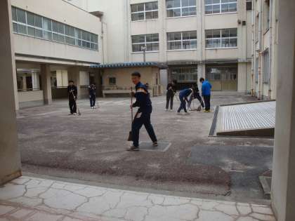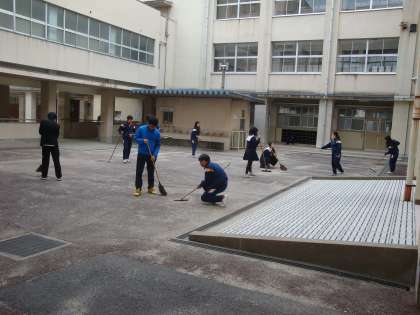 写真は、中庭の清掃の様子です。明日、卒業生はこの中庭の花道を通って巣立っていきます。