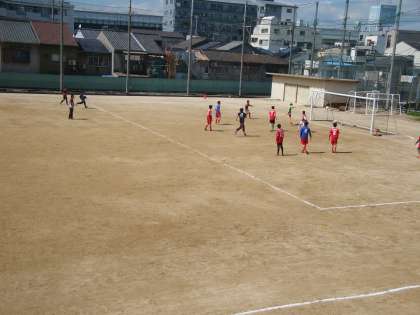 この試合には、保護者の方にも参加していただきました(写真左)。写真右は、在校生のヘディングシュートの瞬間です。