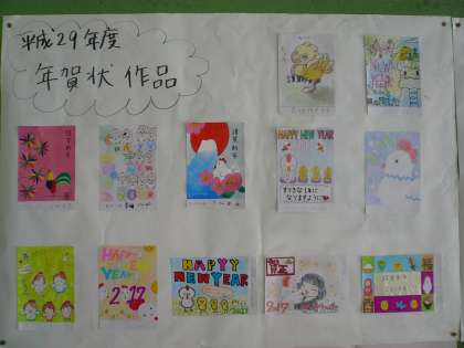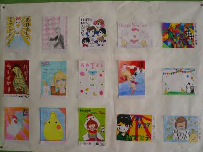 全学年で美術科の冬休みの課題となっていた,「手作り年賀状」で入選した作品が展示されました。好きなキャラクターをアレンジしたものやオリジナリティあふれるものなど,どれも工夫されしっかり彩色されていました。