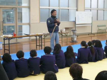 ○区役所防災担当のみなさんから,学校の備蓄倉庫に大切に保管されている「救助資機材」の紹介です。