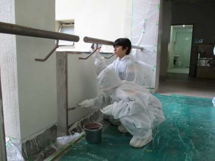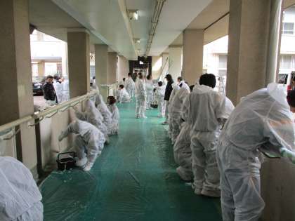 1級塗装技能士の方など16名の方をマイスター指導員として派遣してくださいました。4班に分かれ「塗装教室」が開催され,教えていただきながらの塗装作業です。