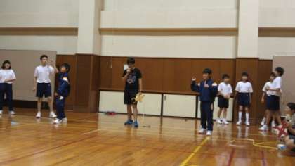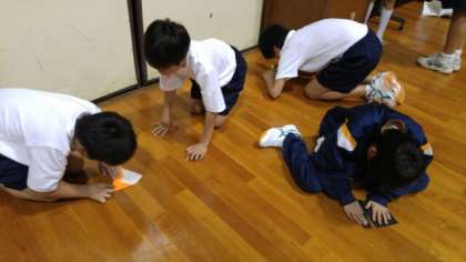 写真は、「背中ボールリレー」と「紙ヒコーキ飛ばし」です。