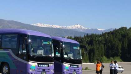 朝の集会です、遠くに白山がくっきり見えています。