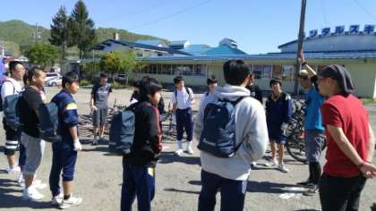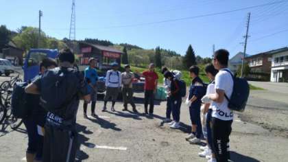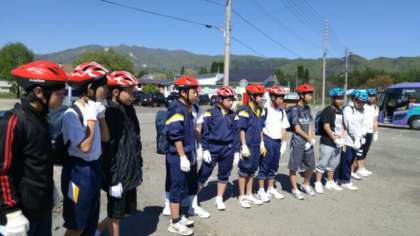 靴ひもとズボンすそを正し、軍手をはめ、ヘルメットをかぶって集合、真剣な表情で説明を聞いています。