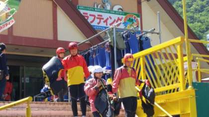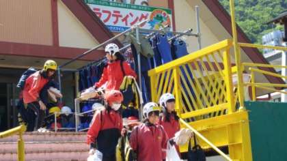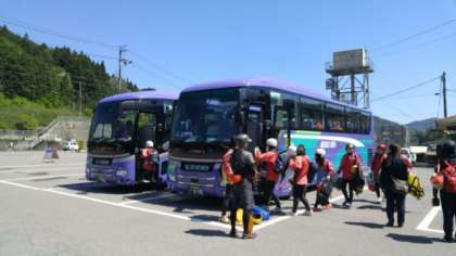 水着に着替え、ジャケット、ヘルメット等を身に着けてバスに乗車しました。