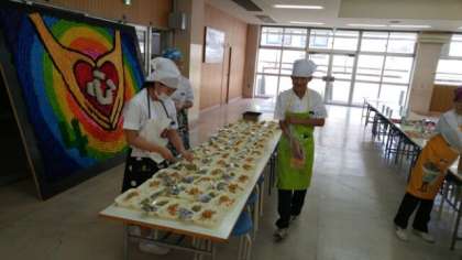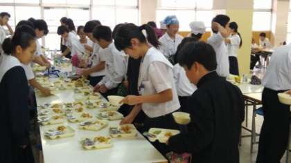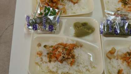 今日のメニューは、かやくご飯、みそ汁、まっ茶ういろう、豆こんぶです。