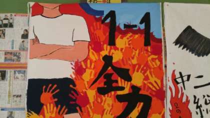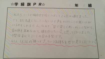 それぞれの学級で、工夫を凝らした素敵な旗です。アピール文もなかなか面白く仕上げてくれました。