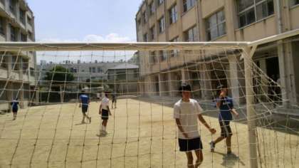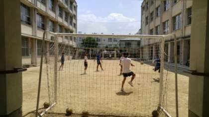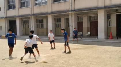 中庭では、ハンドボール部が練習しています。実践を意識したミニゲーム形式の練習のようです。