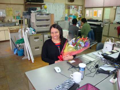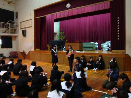 ネイティブ テーチャーとして、今年度8月からお世話になったジェーン先生の授業が、今日で最後となりました。4限目には、体育館に全校生徒が集まって離任式を行いました。とても明るくて元気なジェーンは、生徒からとても人気があり、別れを惜しんでいました。最後に生徒会長から花束の贈呈と英語でのスピーチがあり、ジェーンも感激の様子でした。
