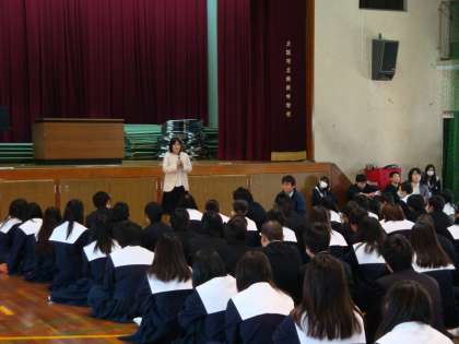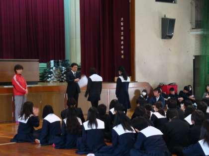 修了式の前に、先週の英語科ネイティブテーチャーの離任式に続いて、1年生の国語科を担当されていました山田先生の離任式が行われました。3月は別れの季節で、子どもたちも少しさびしい様子でした。修了式では、校長先生から、「1年間を振り返って反省すべき点は反省し、新たな目標を立てて、やる気を奮い立たせることが大切です。」というお話がありました。その後、美術の絵画・ポスター作品の表彰伝達があり、20名近い生徒に表彰状・感謝状が授与されました。