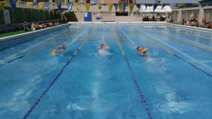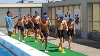 フィンとは、足に付けるひれのことです。上手に使うととても速く泳げます。また、ウォーキングとは、25メートルを歩いて競走するというものです。身長の高い人が有利なようです。