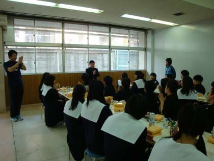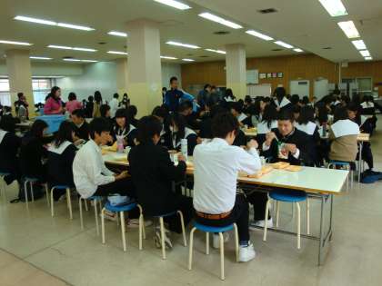 今日から、給食が始まりました。1年〜3年まで、食堂での全員が喫食しています。今日のメニューはエビフライカレーでした。初めてのことなので、準備に、後片付けにと、かなり手間取ってしまいました。喫食方法については、今後も状況を見て検討していきたいと思います。
