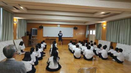 いつもの通り学級代表が整列の指示等を出した後、まずはお手本として教育実習生からの話です。海外でのボランティア経験を踏まえて「私の好きな国、カンボジア」についてのスピーチがありました。