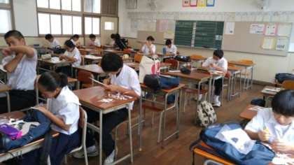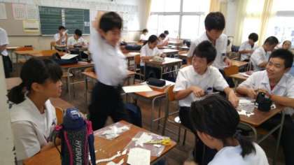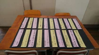1年生の教室では、国語科の先生が川柳展示の準備をしていました。
