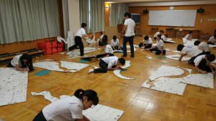 次も一年生。多目的室では、切り抜き恐竜模型の巨大バージョンです。