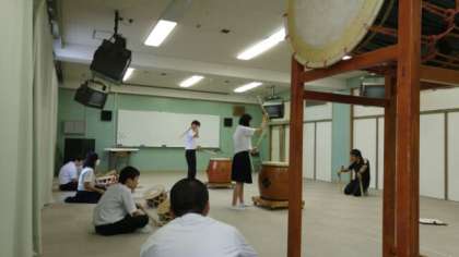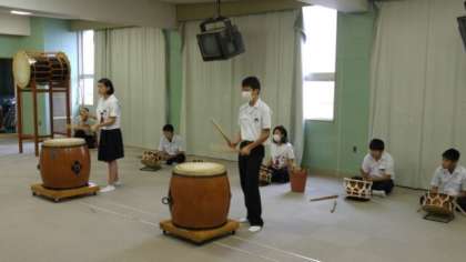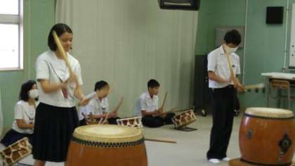 視聴覚室では、3年生が太鼓練習をしています。体の芯に力強い響きが伝わってきました。