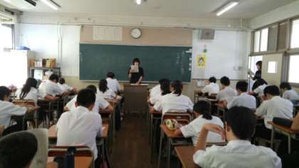 9月25日(月)、担任をはじめ多くの先生の参観の中、教育実習生が1年生の「道徳」の授業を行いました。普段は保健体育の授業なので勝手が違いますが、一生懸命取り組んでいました。