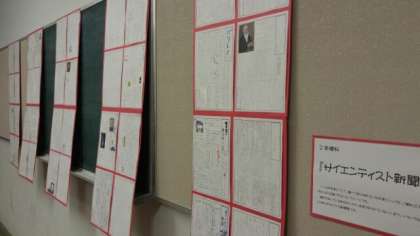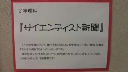 展示(西理科室)2年生は、「サイエンティスト新聞」です。ガリレオやニュートンなど有名な科学者を調べたものが多いですが、中にはマイナーな科学者を調べたものもあります。