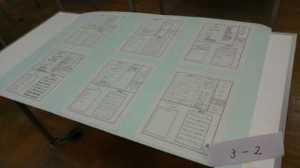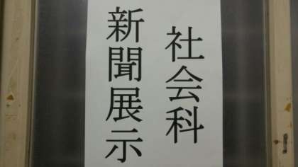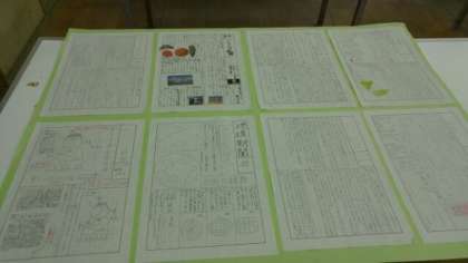 展示(製図室)社会科です。1年生は「地理新聞」です。また、3年生は「高校新聞」ということで高等学校について調べたものを展示しています。