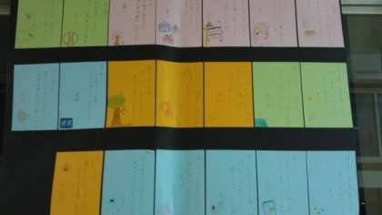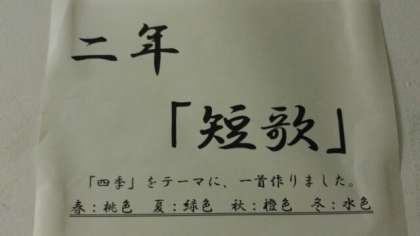 展示(C棟3階廊下)国語科、続いて2年生は「短歌」です。四季をテーマに作成し、それぞれの季節ごとに用紙の色を変化させています。