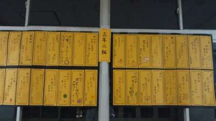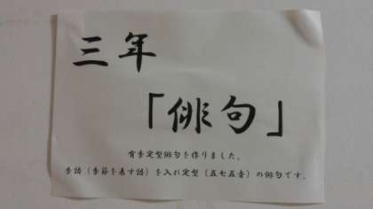 展示(C棟3階廊下)国語科、続いて3年生の俳句です。有季定型(季語を入れた5・7・5の形式)で作られています。